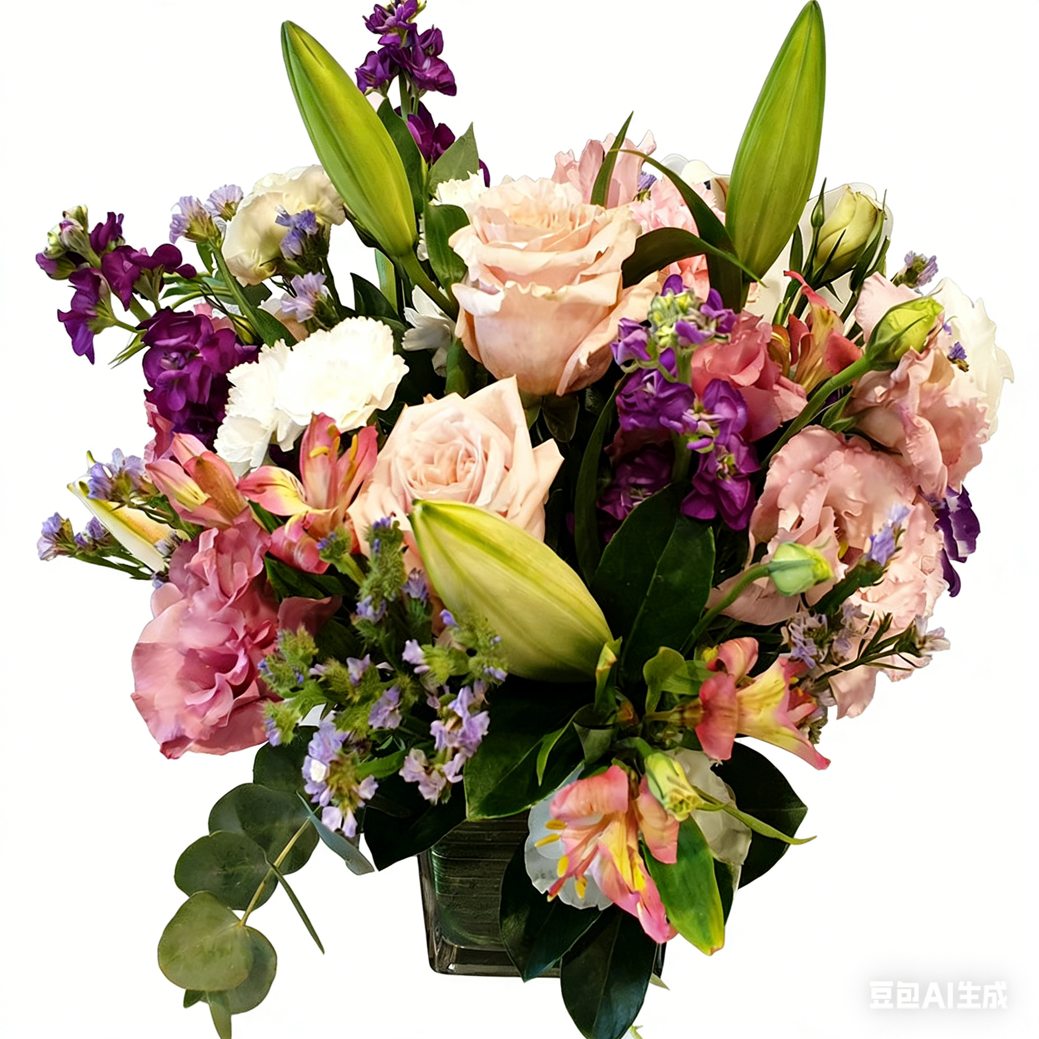 The Blush set in glass cube vase is overflowing with soft pastel and pink flowers in a range of textures, this arrangement sure to delight.